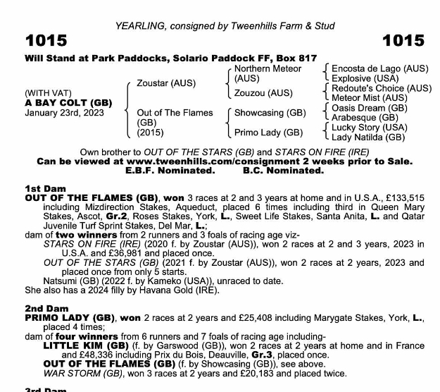 His dam Out Of The Flames was rated 101 and won three races over 5f here and in USA and was placed 3rd in the Queen Mary, Gr 2 at Royal Ascot. She has produced two full sisters to this colt, both winning two races at two and three years of age. The second dam Primo Lady won two races at 2yrs including The Marygate Stakes L, at York. A fast, precious family.