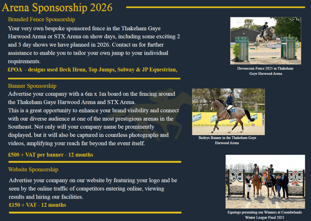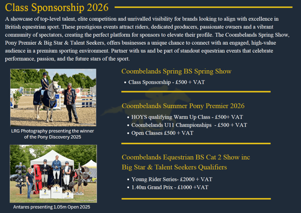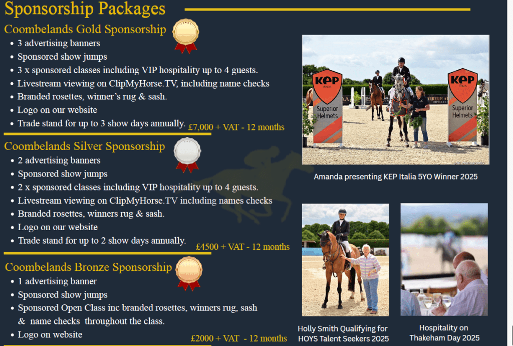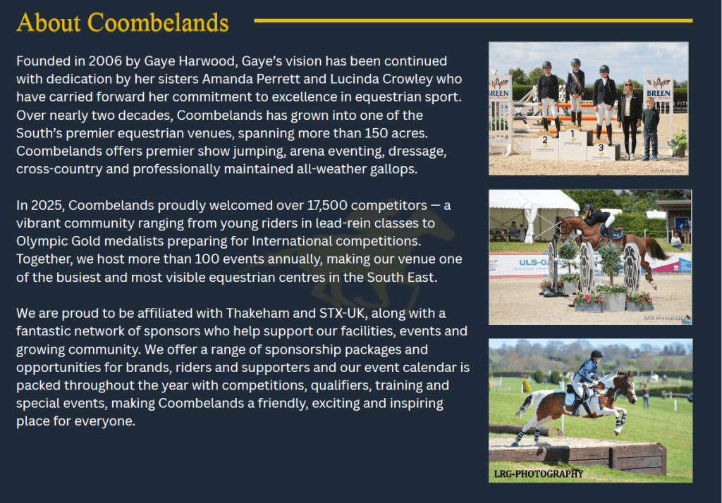 Whether you are seeking to increase brand awareness, network with industry leaders, or simply support a local hub of equestrian excellence, Coombelands Equestrian offers a unique platform for meaningful engagement.